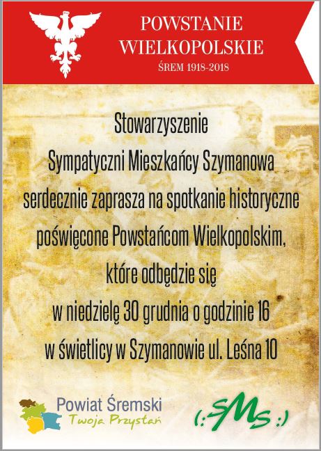 Również w Szymanowie za sprawą stowarzyszenia Sympatyczni Mieszkańcy Szymanowa w niedzielne popołudnie 30 grudnia odbyło się specjalne spotkanie, które w całości zostało poświęcone właśnie pamięci Powstania Wielkopolskiego i jego uczestników.